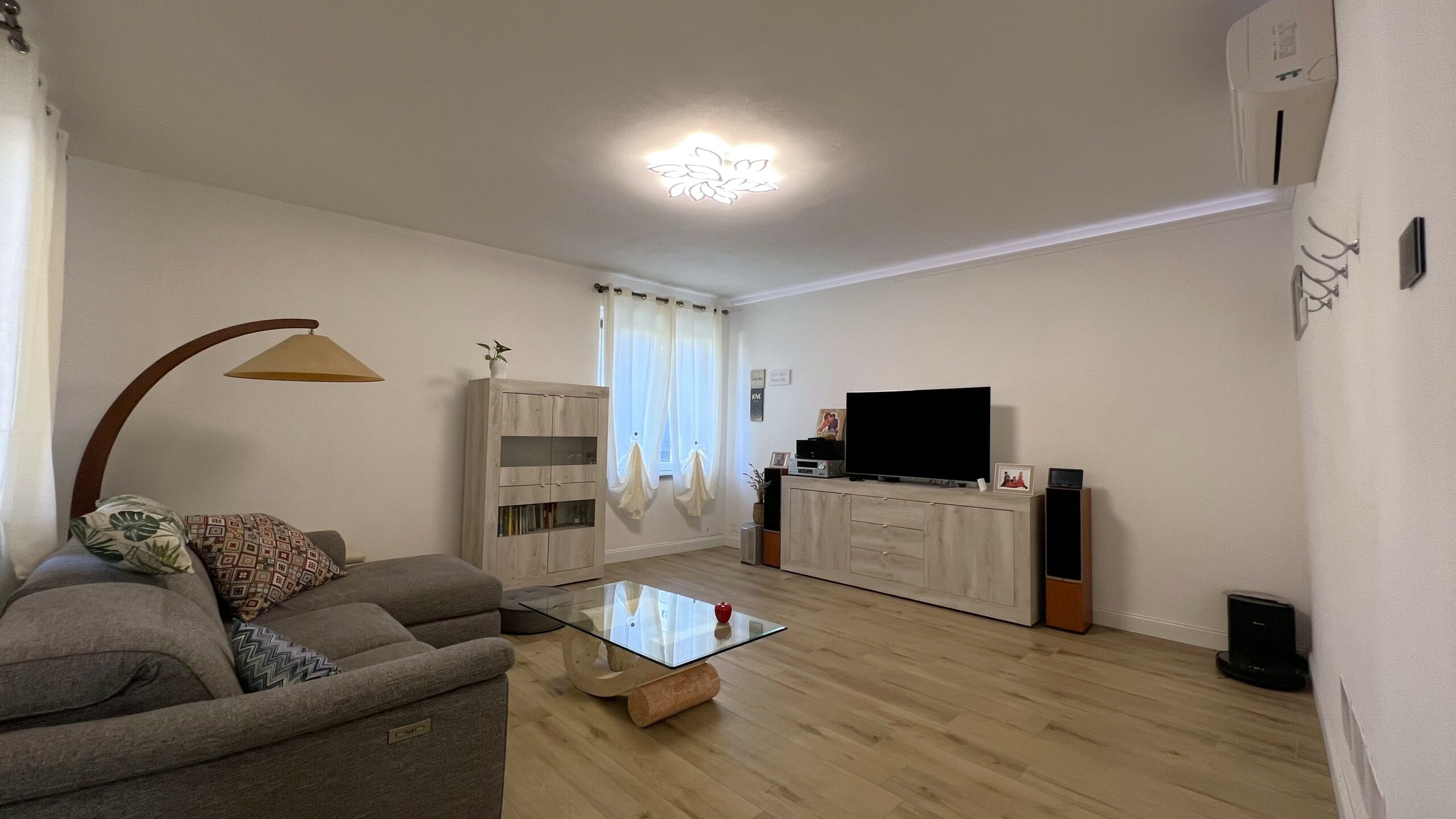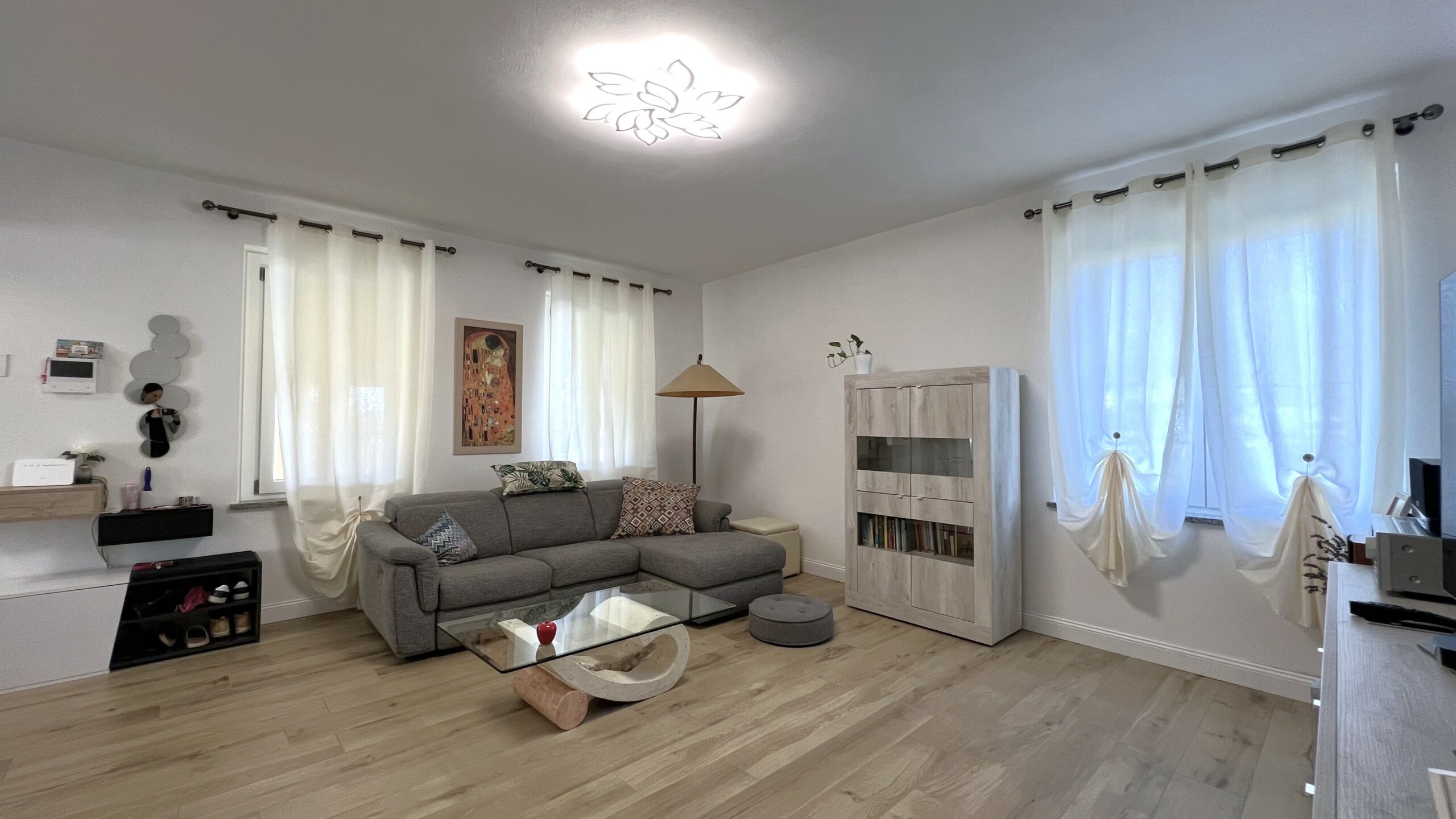 L’ingresso, attraverso un suggestivo porticato, immette, al piano terra, ad un’elegante zona living costituita da luminoso salone e cucina abitabile che si apre alla sala da pranzo con il sapiente utilizzo della penisola dal gusto moderno, ampiamente disimpegnato, il grande bagno di servizio con doccia completa il piano.