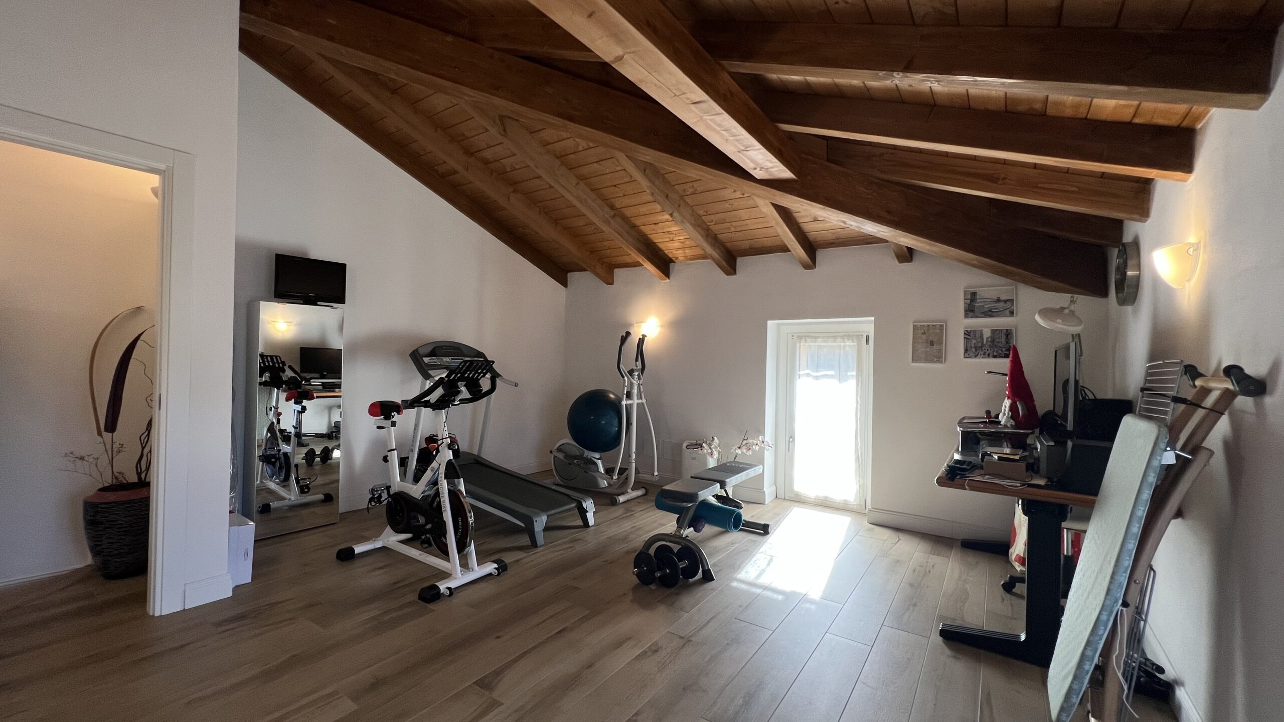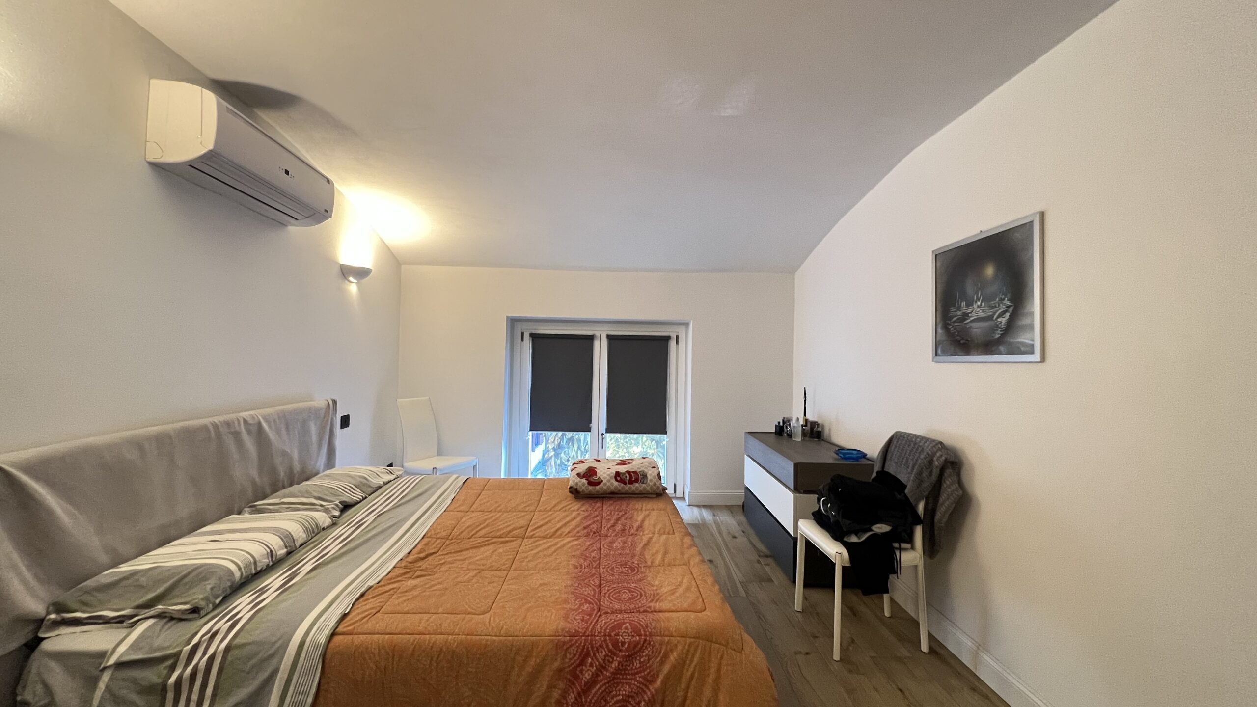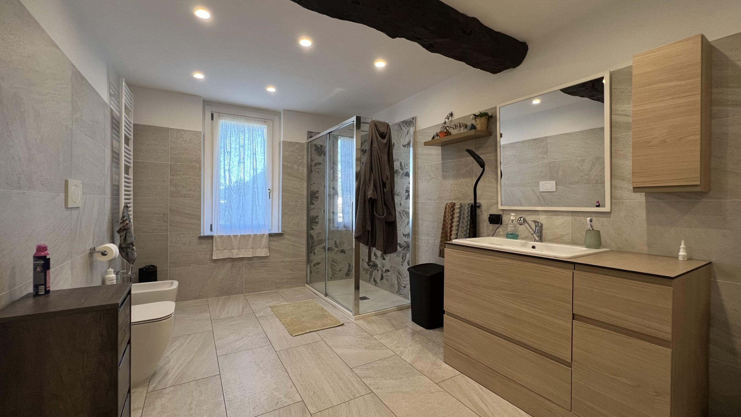 Al livello superiore, la zona notte si compone da camera matrimoniale con vista panoramica, servita da cabina armadio finestrata e grande bagno padronale con vasca idromassaggio e box doccia doppio, oltre ad altre due camere matrimoniali di cui una con travi a vista rifinite.