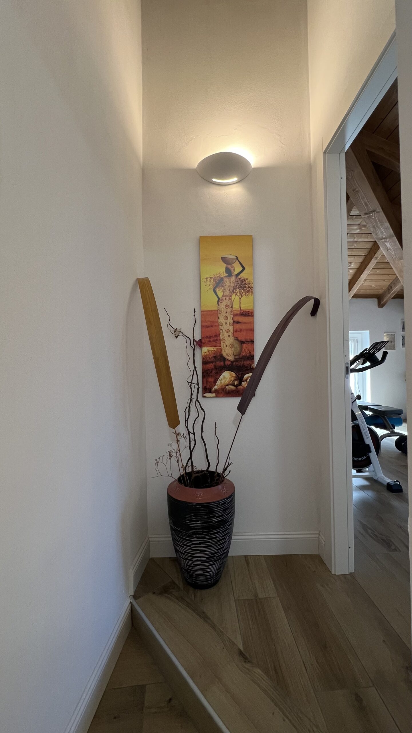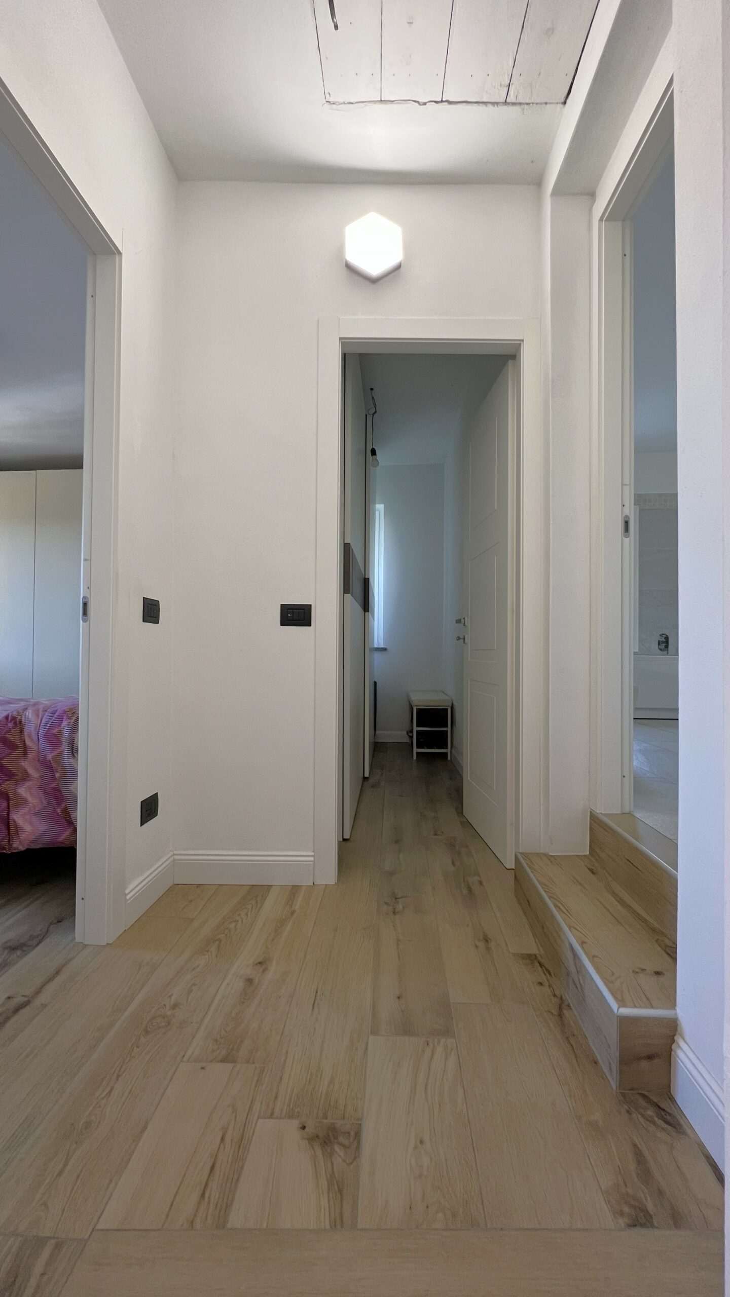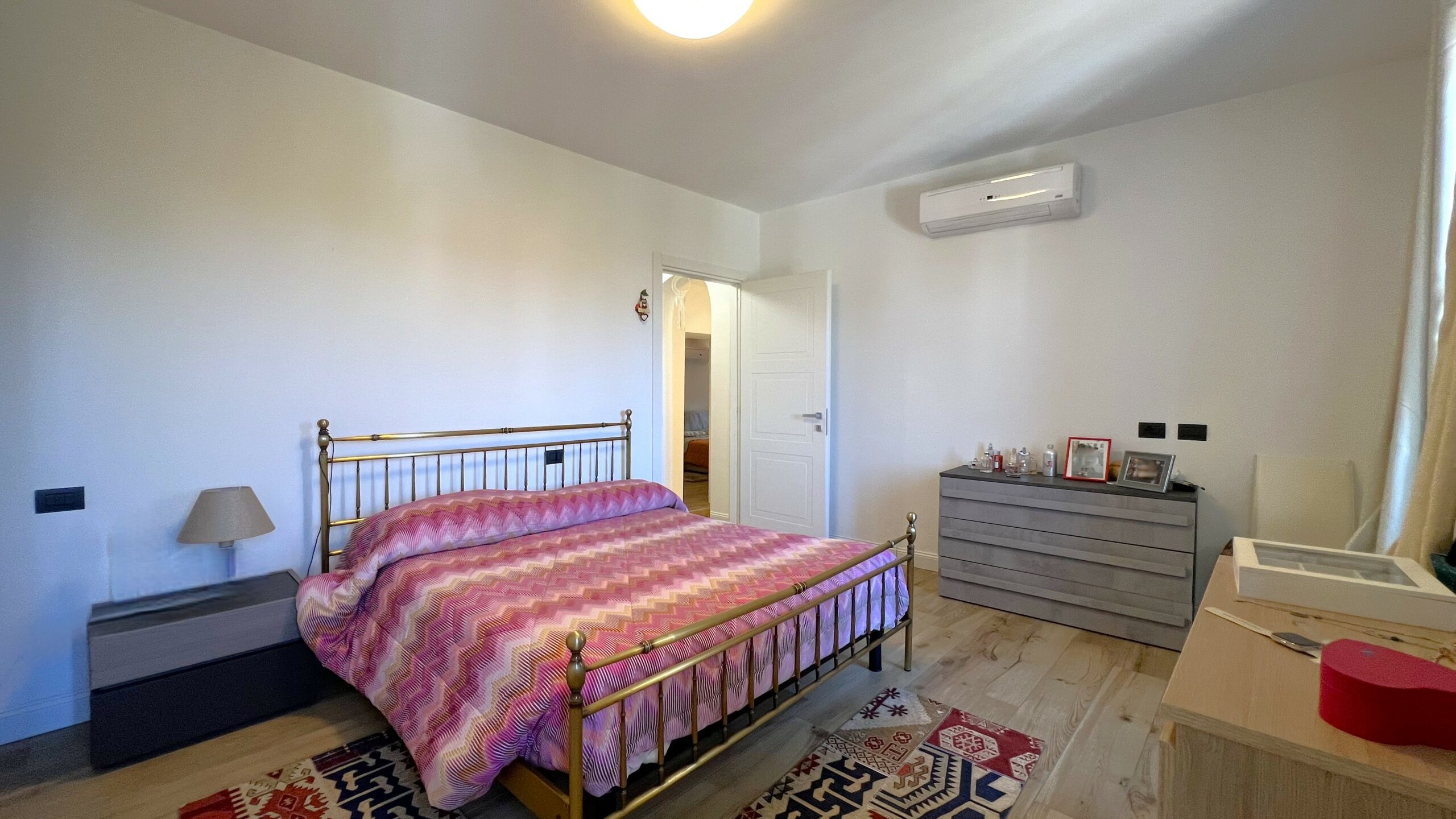 Al livello superiore, la zona notte si compone da camera matrimoniale con vista panoramica, servita da cabina armadio finestrata e grande bagno padronale con vasca idromassaggio e box doccia doppio, oltre ad altre due camere matrimoniali di cui una con travi a vista rifinite.